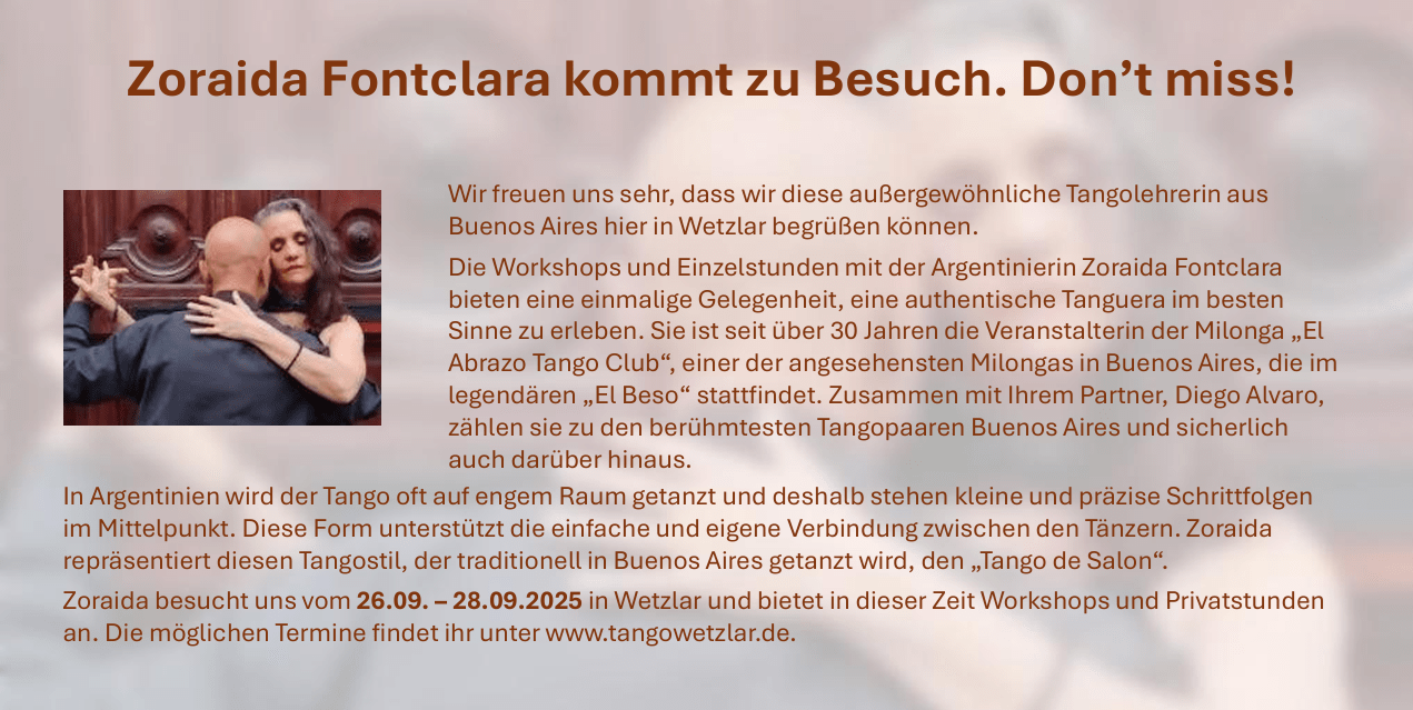 Zoraida Fontclara kommt zu Besuch! Wir freuen uns sehr, dass wir diese außergewöhnliche Tangolehrerin aus