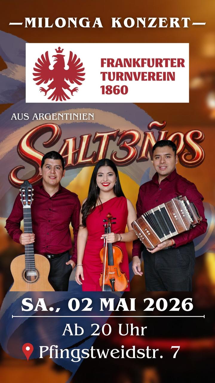 Mai 2 Milonga am Zoo mit live Musik von “Los Salt3ños” 2. Mai @ 20:00 - 00:00 CEST FTV 1860 Ravenstein-Zentrum, Hans-Grötsch-Halle Pfingstweidstraße 7, Frankfurt am Main Veranstaltung Details Wegbeschreibung