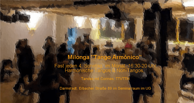 Fast immer am 4. Sonntag, im Monat veranstalten wir die Milonga Tango Armónico: Tangos- und Non-Tangos in einer harmonischen Zusammenstellung und entspannter Atmosphäre.